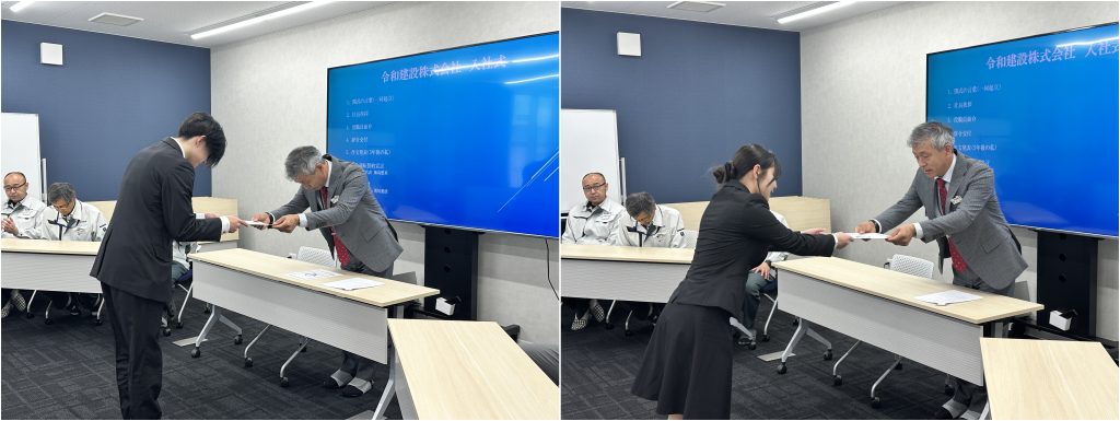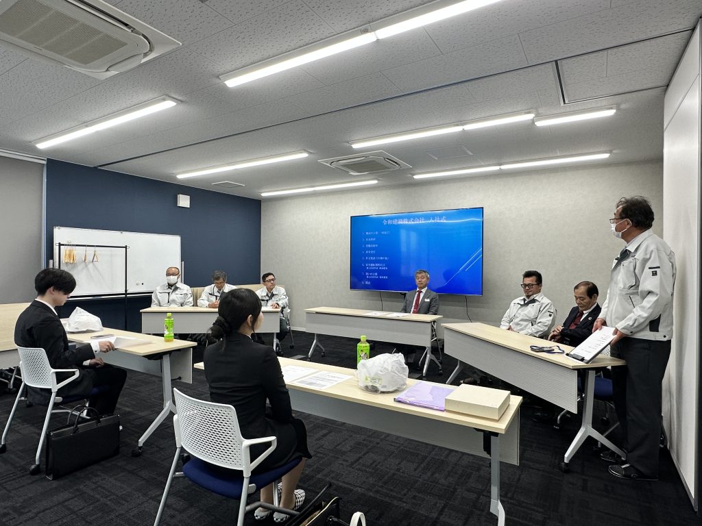 2026.04.20 お知らせ 新入社員入社のお知らせ ご報告がおそくなりましたが、令和8年4月1日付で新入社員2名が入社いたしました。 それぞれ、土木部および総務部へ配属となっております。 当日は入社式を執り行いました。 また同日、豊富な経験を持つベテラン社員1名も入社しております。 今後、現場等で皆様とお会いする機会もあるかと存じますので、 その際はどうぞよろしくお願い申し上げます。 お知らせ一覧